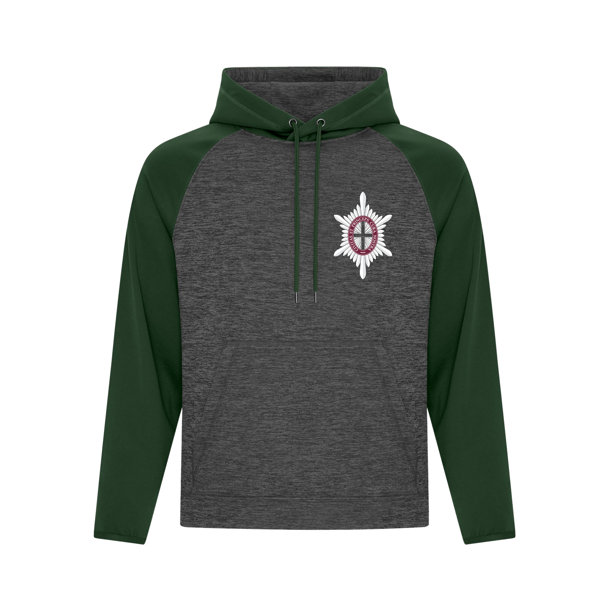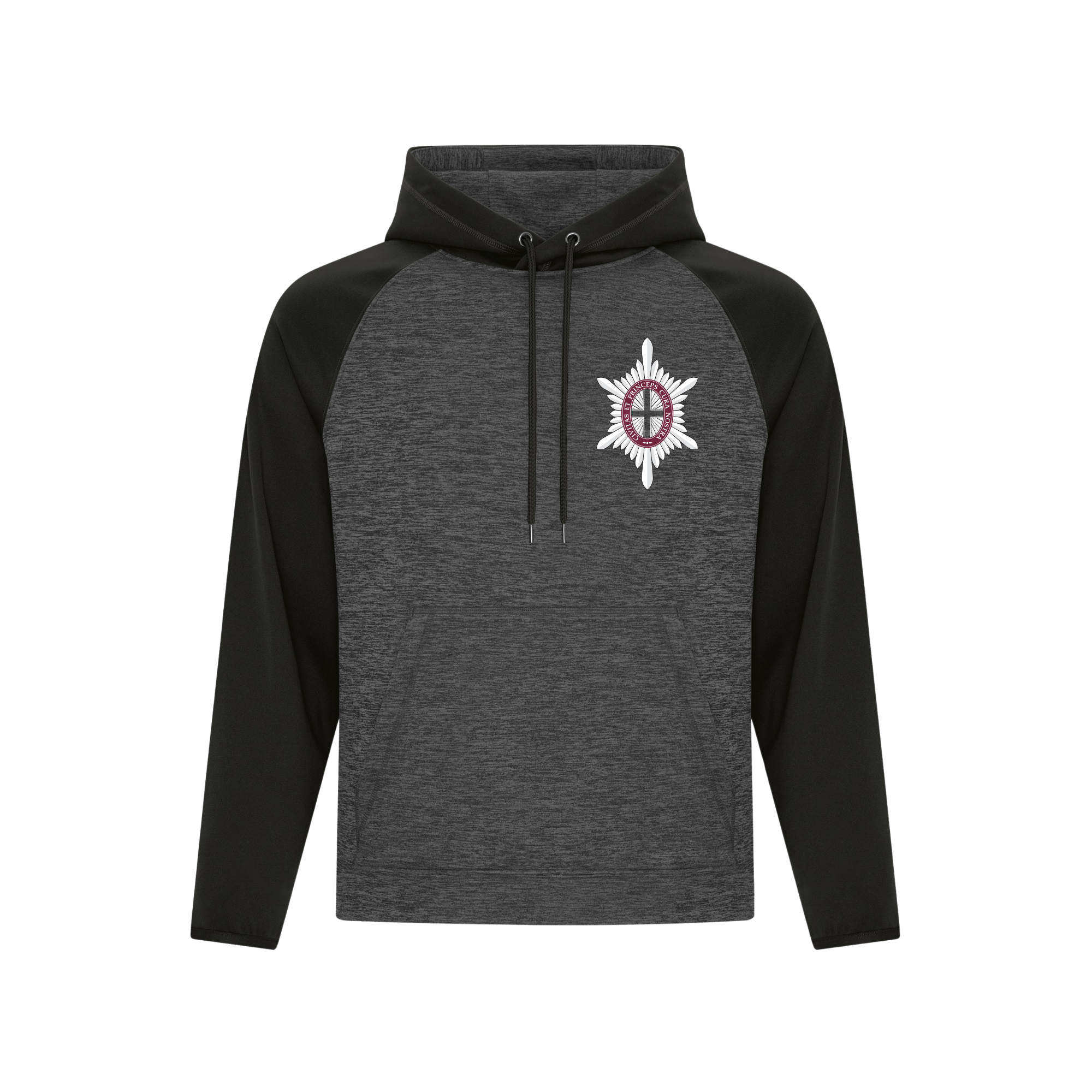Baseball style hoodie. 100% performance polyester interlock with wicking technology
