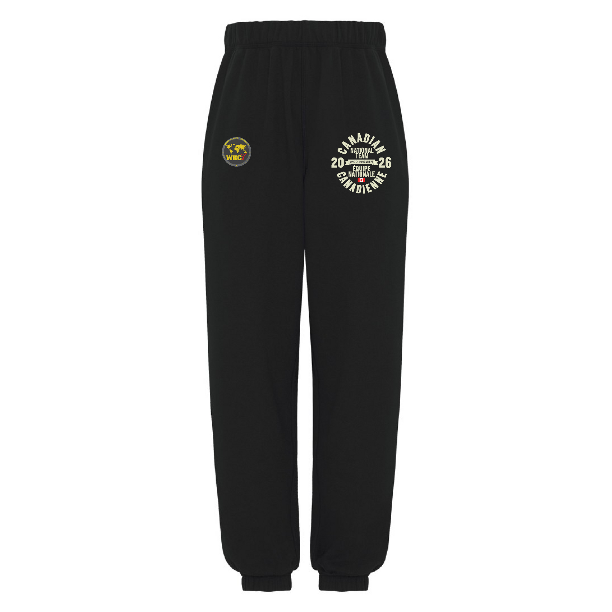 Youth black Unisex Sweatpants. Made with 13-oz, 50/50 cotton/polyester fleece material. Comes with elastic cuffs, front pockets, and an elastic waistband with no drawstring.